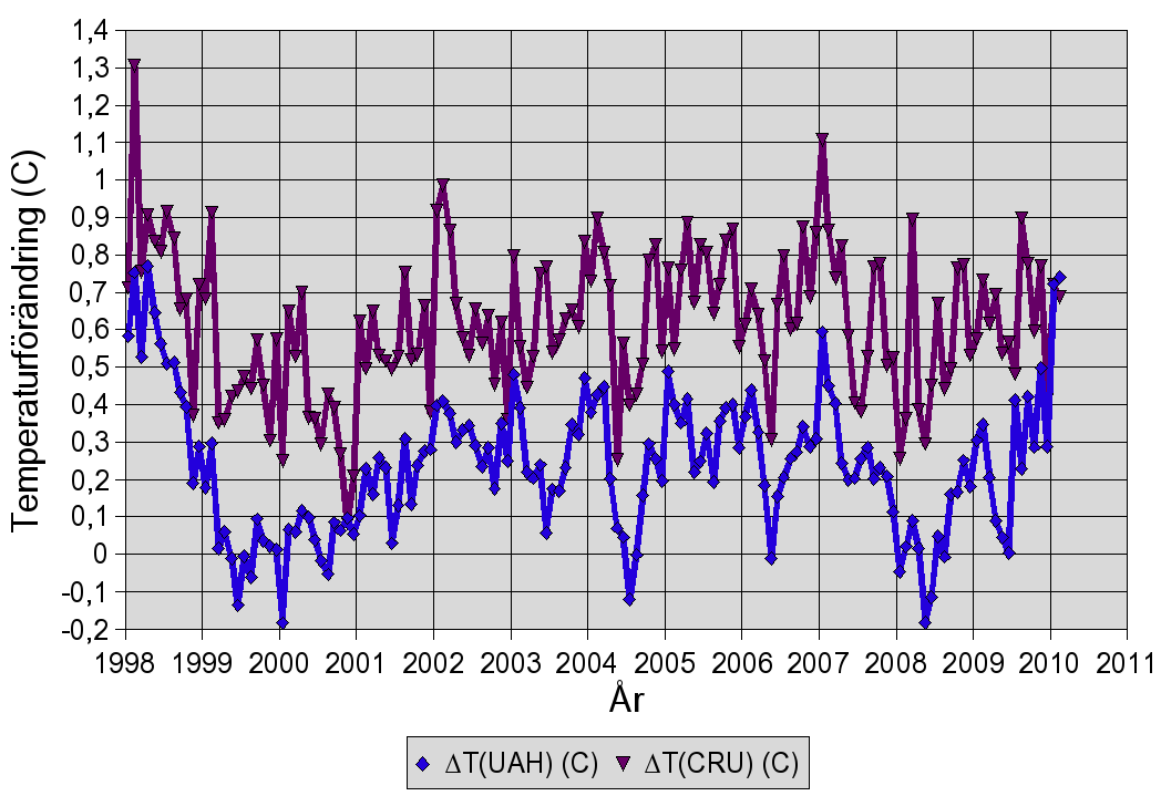 www.lars-kamel.se Har världen blivit varmare det senaste decenniet? Nej, inte enligt flera av de grupper som försöker räkna ut hur världens medeltemperatur varierar. För detta måste beräknas, eftersom det inte finns någon termometer som mäter världens medeltemperatur. På samma tid har luftens koldioxidhalt ökat med ungefär 5 %. Så här ser temperaturkurvan ut sedan 1998, månad för månad, enligt beräkningar från Climate Research Unit (CRU) i England (jordytans temperatur) och University of Alabama, Hultsville (UAH) i USA (troposfärens temperatur):