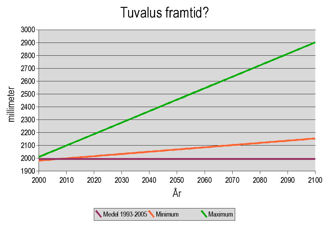 Som synes är framtiden högst osäker. Enligt den mindre trenden kommer havsytan vid Tuvalu att stiga med bara knappt två decimeter, jämfört med medlet för åren 1993-2005. Enligt den högre trenden stiger havsytan med nästan en meter. Det senare ger antagligen stora problem för ett örike med en högsta punkt på fem meter, men det är ändå inte tillräckligt för att sluka öarna. Inte ens år 2100 kommer Tuvalu att vara slukat av vågorna.