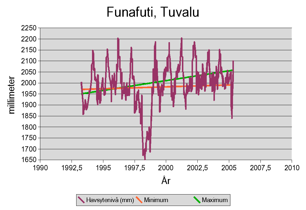 Som tur är, finns mätningar av havsytenivåer från Tuvalus huvudö och huvudstad, Funafuti. Ett diagram över dessa mätningar ser ut så här: