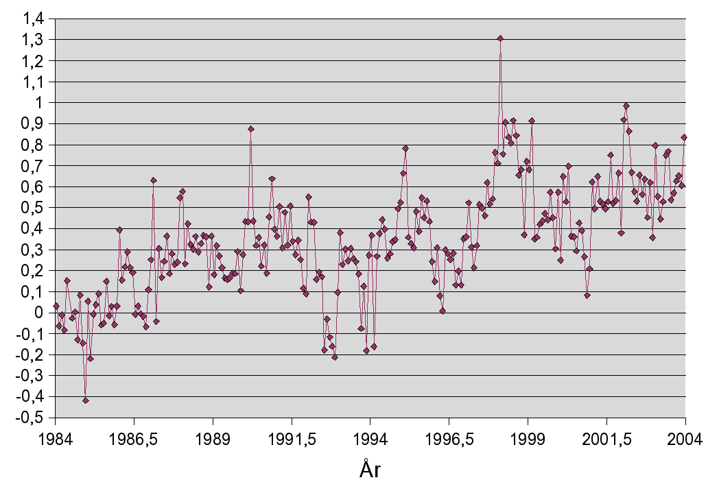 Den röda linjen år 1990 i det översta diagrammet visar hur mycket extra strålning jordytan beräknas ta emot till följd av den ökande halten av växthusgaser i atmosfären. Som synes är denna röda linje betydligt mindre än de variationer som orsakas av albedoförändringar. Det undre diagrammet visar att uppvärmningen under denna period har varit ungefär 0,6 grader, med enstaka, högre, tillälliga toppar. Så om dessa växthusgaser kan få världen att bli rejält varmare, varför ser vi inte hela tiden Jordens medeltemperatur gå upp och ned med flera grader, som svar på förändringarna i Jordens albedo? Ja, det är en synnerligen intressant fråga att försöka hitta svar på.