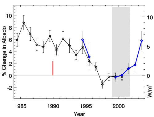 Albedo är ett mått på ett objekts reflektionsförmåga. Den, till synes enkla, definitionen är att det är den strålning, till exempel i form av ljus, som reflekteras, dividerat med den strålning eller det ljus som totalt når objektet. Ett perfekt vitt objekt reflekterar då allt inkommande ljus, medan ett perfekt svart objekt reflekterar ingenting. Svarta hål kanske du har hört talas, och svarta hål är verkligen svarta objekt enligt denna definition. Det betyder dock inte att alla svarta objekt är svarta hål. I verkligheten är det saker och ting dock mer komplicerade. Reflektionen beror nämligen på i vilken vinkel ljuset kommer in mot en yta. Hur mycket ljus du ser från ytan, beror dessutom på i vilken vinkel du ser den. Reflexen från en solbelyst spegel eller fönsterruta är ett exempel på detta. Bara i en viss vinkel speglas solen, medan andra vinklar bara visar det diffusa ljus som kommer från alla håll. Utan detta diffusa ljus, skulle du bara se solreflexen och allt annat skulle vara svart. I detta fall är det ganska enkelt. Det ljus som lämnar spegeln/fönstret har samma vinkel mot ytan som det inkommande ljuset. För andra ytor kan det vara mer komplicerat, då ljuset kan spridas och speglas flera gånger innan det kommer ut igen. Ett exempel är en sandstrand. Inte har du någonsin sett solens spegelbild i sanden? Det går helt enkelt inte. Reflektionsförmågan beror dessutom ofta på våglängden. Ett typexempel är ju all växtlighet på sommaren. Den ser grön ut för att den reflekterar grönt ljus bättre än någon annan våglängd. Just spegeln är faktiskt ett av undantagen. Den reflekterar alla våglängder av synligt ljus i stort sett lika. Det är därför den fungerar så bra som spegel. Försöker du däremot få radiosignaler att reflekteras i spegeln, kan det bli problem. Så även om reflektionsförmågan kan vara densamma över ett stort intervall av våglängder, är den knappast så för alla våglängder. Givet alla dessa svårigheter, är det knappast märkligt att det finns flera olika sätt att räkna ut ett albedo. Det sätt som är vettigast för såväl astronomer som meteorologer är att tänka sig att Jorden är en skiva, vänd mot solen, att en tänkt observatör sitter på solytan, och räkna ut medelvärdet på reflekterat synligt ljus plus den ultravioletta och infraröda strålning som ligger nära detta ljus. Med detta albedo känt, går det sedan att någorlunda enkelt räkna ut effekterna av att Jorden faktiskt är klotformad och vad en observatör någon annanstans i universum skulle se. Detta albedo är för Jorden ungefär 0,3, det vill säga cirka 30 % av solstrålningen reflekteras direkt tillbaka till rymden. Det är dessa 30 % som satelliter och astronauter ser när de fotograferar jordytan. Detta albedo är inte en konstant. Det varierar lite hela tiden, mer eller mindre. Årstidsvariationen kan du kanske själv tänka dig. På norra halvklotet finns stora landmassor som har varma somrar och kalla vintrar. På sommaren är detta land täckt av grönska och ganska mörk. På vintern är det mesta i norr täckt av snö och därmed ljust. På södra halvklotet dominerar oceanerna och det blir inte alls lika dramatiska förändringar med årstiderna. Dessutom har ju olika delar av jordytan vid varje tidpunkt olika albedo. Det är ju självklart egentligen. Öknar och snö- eller istäckta ytor är ljusa. Bar mark utan växtlighet är mörk, liksom ofta skogar och grässlätter. Sädesfält är däremot ganska ljusa. Här finns en möjlighet för människor att faktiskt påverka Jordens albedo. Hugg ner en skog och odla upp marken, och du har gjort jordytan ljusare. Molnighet är i alla högsta grad betydelsefullt för albedot. Moln är ju nästan alltid ljusare än den mark eller det vatten de skymmer. Ökar molnigheten blir Jorden ljusare, och minskar den blir Jorden mörkare. I genomsnitt är 65-70 % av jordytan skymd av moln i varje ögonblick, men också den siffran varierar. Förändras albedot, handlar det inte bara om att Jorden ser ljusare eller mörkare ut från rymden. Ljusare, till exempel, innebär ju att mer strålning försvinner direkt tillbaka till rymden, utan att värma upp marken och atmosfären. Då blir det kallare. Variationer i albedot har direkt och märkbar påverkan på klimatet. Det intressanta är att forskare de senaste åren har upptäckt att Jordens albedo varierar mycket mer än man tidigare trodde. Sedan 1980-talet har albedot gått både upp och ned med en storlek som svarar mot förändringar som är flera gånger större än alla de växthusgaser människan har släppt ut genom historien. Här är ett diagram som visar hur albedot har varierat de senaste decennierna: